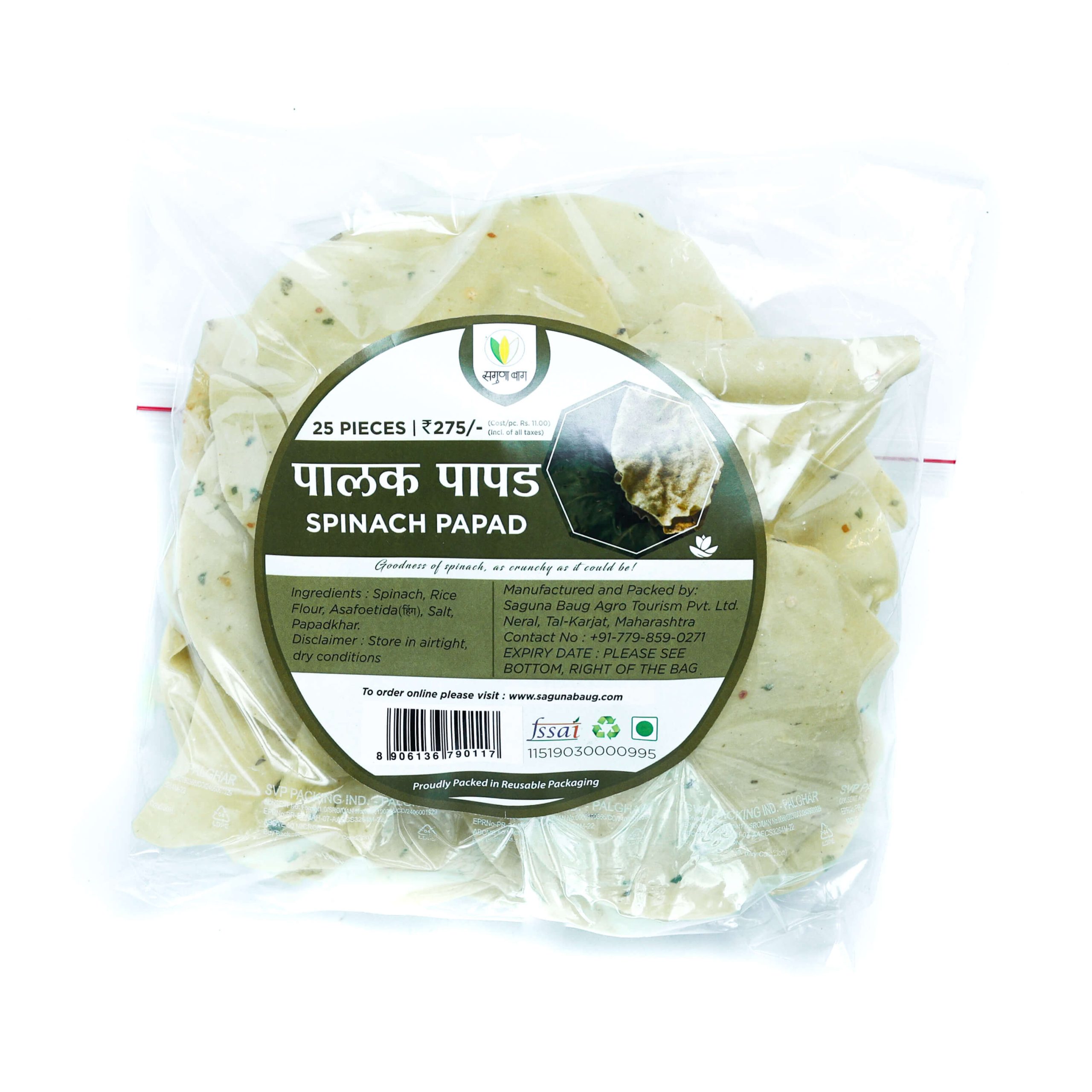 - PREMIUM INGREDIENTS: Our 55 Acre Farm comes in handy while we deliver the most freshly harvested Spinach to concoct homely and healthy Palak Papads with a mild blend of spices homegrown in the same farmlands.